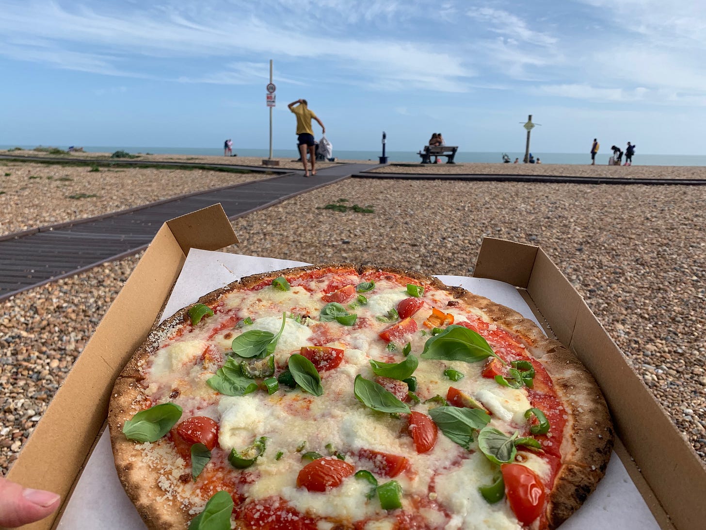 Shoreham Beach near Brighton has a great place for pizza. Sometimes on bike rides, especially if it’s hot, I order one and sit on the beach to eat it. The light is amazing. Paradise.