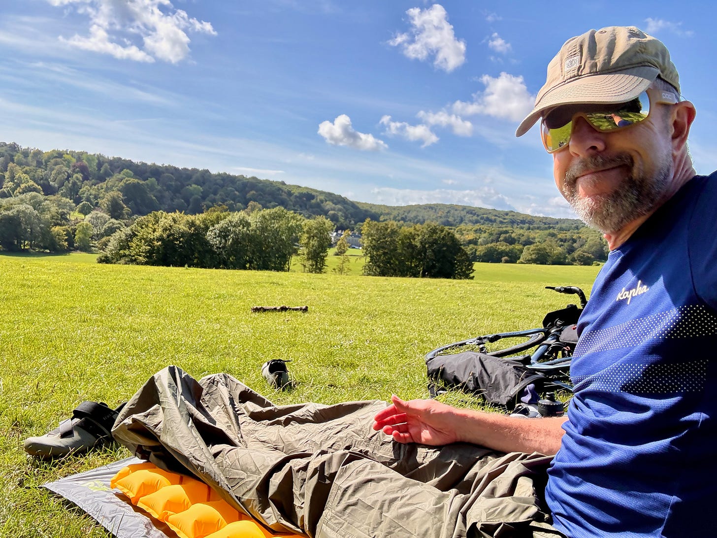 The other day I cycled up a trail to a hill in Stanmer Park in South Downs on a fully laden bike to try out my new bikepacking sleep setup. It was a beautiful warm sunny day, but the strong breeze rushed up the hills and cooled me down. I lay down in my bivvy and fell asleep under the trees.